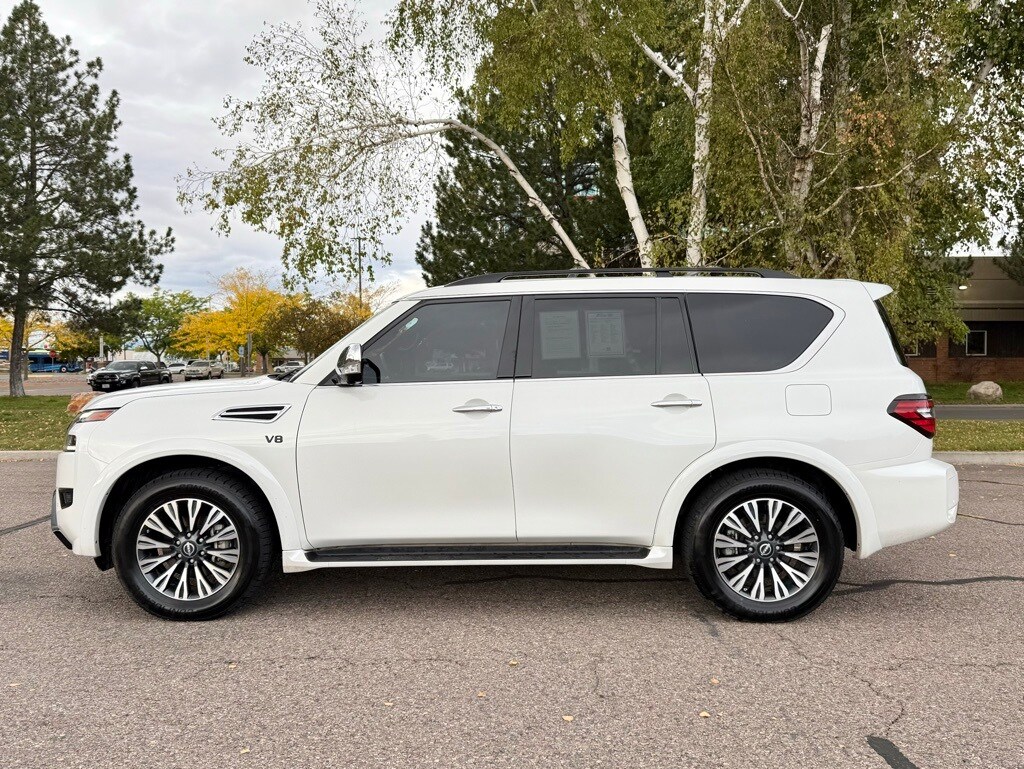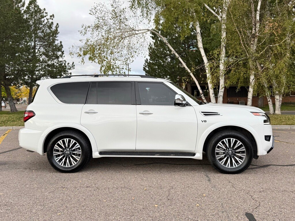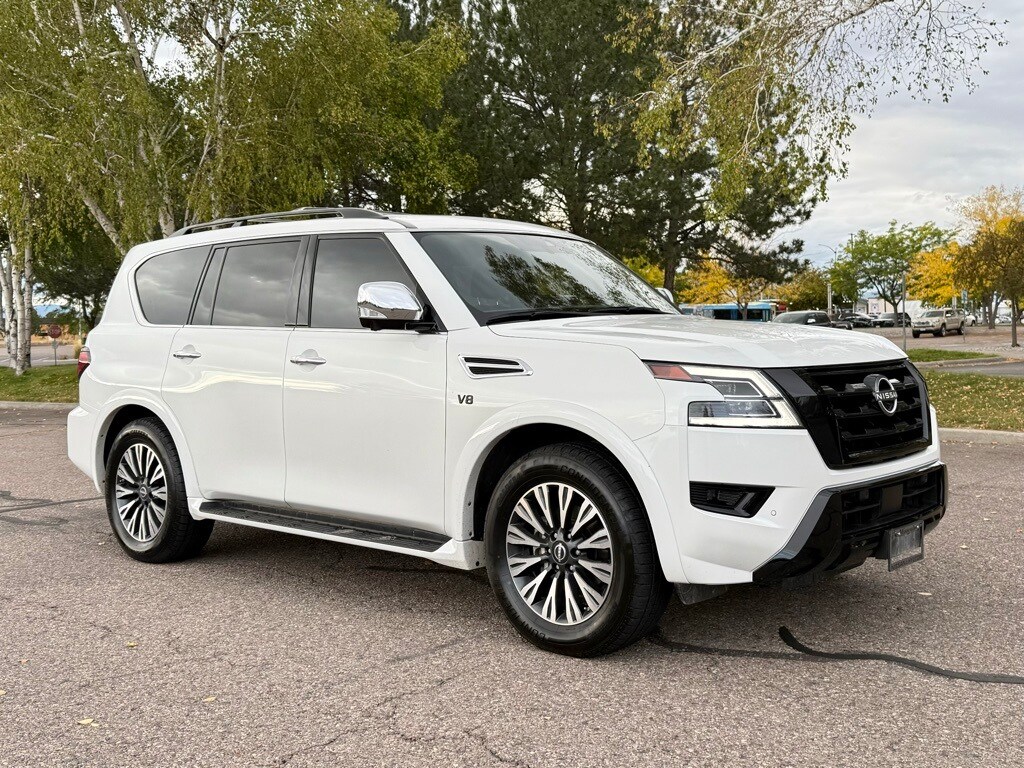 Low Miles!, Clean Carfax!, LOADED!, CERTIFIED PRE-OWNED!, 13 Speakers, 20" x 8J Aluminum Alloy Wheels, 2nd Row Captain's Chairs, 2nd Row Center Console w/Padded Armrest, Active Cruise Control, Auto High-beam Headlights, Auto-Dimming Exterior Mirror w/LED Turn Signals, Auto-leveling suspension, Automatic temperature control, Black Painted Grille, Black Painted Roof Rails, Captain's Chairs Package, Cargo Mat & Midnight Edition Floor Mats, Electronic Stability Control, Exterior Parking Camera Rear, Front & Rear Lower Center Bumper Fascias, Front dual zone A/C, Fully automatic headlights, Heated door mirrors, Heated Front Bucket Seats, Leather Appointed Seat Trim, Memory seat, Midnight Edition Package, Navigation System, NissanConnect featuring Apple CarPlay and Android Auto, Power Liftgate, Power moonroof, Radio: NissanConnect w/SiriusXM, Rear LED Lamps w/Black Paint Finisher, Remote keyless entry, Steering wheel memory, Steering wheel mounted audio controls, Traction control. Captain's Chairs Package (2nd Row Captain's Chairs and 2nd Row Center Console w/Padded Armrest), Midnight Edition Package (20" x 8J Aluminum Alloy Wheels, Auto-Dimming Exterior Mirror w/LED Turn Signals, Black Painted Grille, Black Painted Roof Rails, Cargo Mat & Midnight Edition Floor Mats, Front & Rear Lower Center Bumper Fascias, Leather Appointed Seat Trim, and Rear LED Lamps w/Black Paint Finisher), 13 Speakers, Active Cruise Control, Auto High-beam Headlights, Auto-leveling suspension, Automatic temperature control, Electronic Stability Control, Exterior Parking Camera Rear, Front dual zone A/C, Fully automatic headlights, Heated door mirrors, Heated Front Bucket Seats, Memory seat, Navigation System, NissanConnect featuring Apple CarPlay and Android Auto, Power Liftgate, Power moonroof, Radio: NissanConnect w/SiriusXM, Remote keyless entry, Steering wheel memory, Steering wheel mounted audio controls, Traction control, 3rd row seats: split-bench, 4-Wheel Disc Brakes, ABS brakes, Air Conditioning, AM/FM radio: SiriusXM, Anti-whiplash front head restraints, Auto tilt-away steering wheel, Auto-dimming door mirrors, Auto-dimming Rear-View mirror, Brake assist, Bumpers: body-color, Delay-off headlights, Driver door bin, Driver vanity mirror, Dual front impact airbags, Dual front side impact airbags, Emergency communication system: NissanConnect Services, Four wheel independent suspension, Front anti-roll bar, Front Center Armrest, Front fog lights, Front reading lights, Garage door transmitter: HomeLink, Illuminated entry, Illuminated Kick Plates, Knee airbag, Leather Shift Knob, Low tire pressure warning, Occupant sensing airbag, Outside temperature display, Overhead airbag, Overhead console, Panic alarm, Passenger door bin, Passenger vanity mirror, Power door mirrors, Power driver seat, Power passenger seat, Power steering, Power windows, Rear air conditioning, Rear anti-roll bar, Rear reading lights, Rear seat center armrest, Rear window defroster, Rear window wiper, Reclining 3rd row seat, Security system, Special Paint - Aspen White, Speed-sensing steering, Speed-Sensitive Wipers, Split folding rear seat, Spoiler, Tachometer, Telescoping steering wheel, Tilt steering wheel, Trip computer, Turn signal indicator mirrors, Variably intermittent wipers, and Voltmeter.